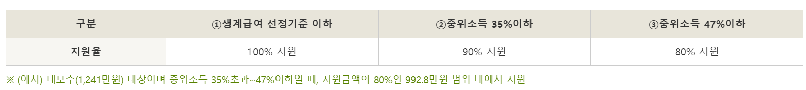 ⊙ 수급자의 소득인정액에 따라 100~80%까지 차등지원