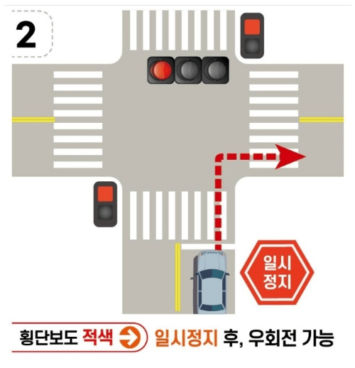⊙ 전방 차량 신호가 적생인 경우, 횡단보도가 적색일 때 : 정지선에 맞춰 일시정지 후, 우회전 가능